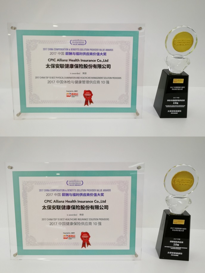 11月22日,太保安聯(lián)健康險在2017中國薪酬與福利年會中榮獲“2017中國健康保險供應(yīng)商十強”及“2017中國體檢與健康管理供應(yīng)商十強”兩項大獎。