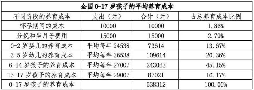 據(jù)《中國(guó)生育成本報(bào)告2024版》統(tǒng)計(jì),全國(guó)家庭0-17歲孩子的養(yǎng)育成本平均為53.8萬(wàn)元,而0歲至大學(xué)本科畢業(yè)的養(yǎng)育成本平均為約68萬(wàn)元。