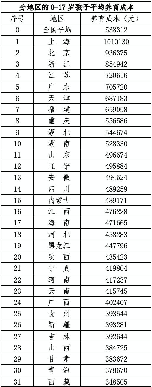 按地區(qū)來(lái)看,在上海和北京養(yǎng)娃,養(yǎng)育成本甚至分別高達(dá)101萬(wàn)元、93.6萬(wàn)元!